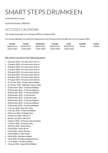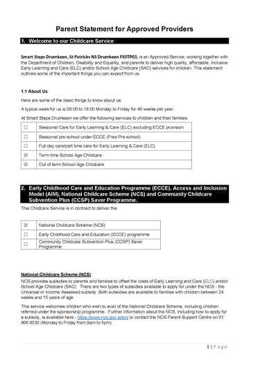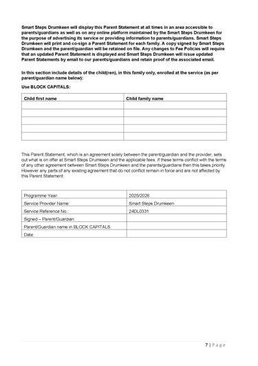 This page provides important information for parents including our fees information, the parent statement and the National Childcare Scheme service calendar.
